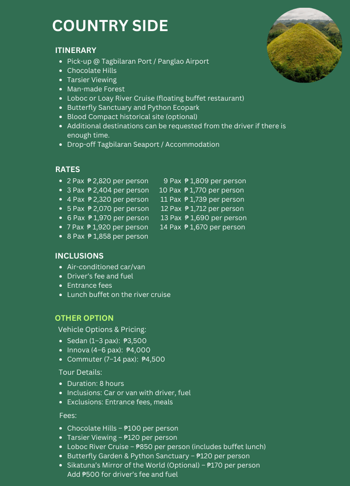 Highlights of the Bohol Countryside Tour:
