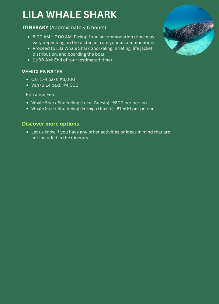 Unlike some whale shark interaction sites where feeding is involved, the Lila Whale Shark tour focuses on natural encounters. The whale sharks are not lured by food, allowing for a more authentic experience of observing these majestic creatures in their natural environment.