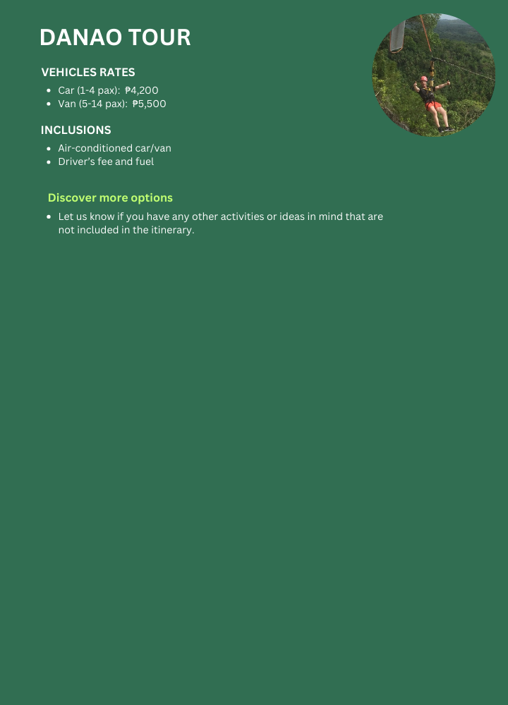 The highlight of the Danao Tour is a visit to the Danao Adventure Park, a premier destination for thrill-seekers. Set against the backdrop of stunning hills and lush greenery, this adventure park offers a variety of exciting activities: