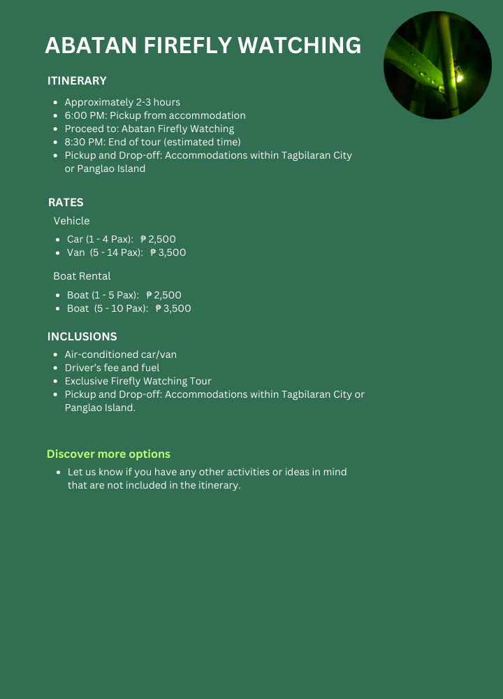 The Abatan Firefly Watching tour is committed to sustainable tourism. The tour guides emphasize the importance of protecting the fireflies and their natural habitat, as these incredible insects are vital to maintaining the local ecosystem. By participating in this eco-tour, you are supporting efforts to preserve Bohol’s natural wonders while enjoying a beautiful and peaceful experience.
